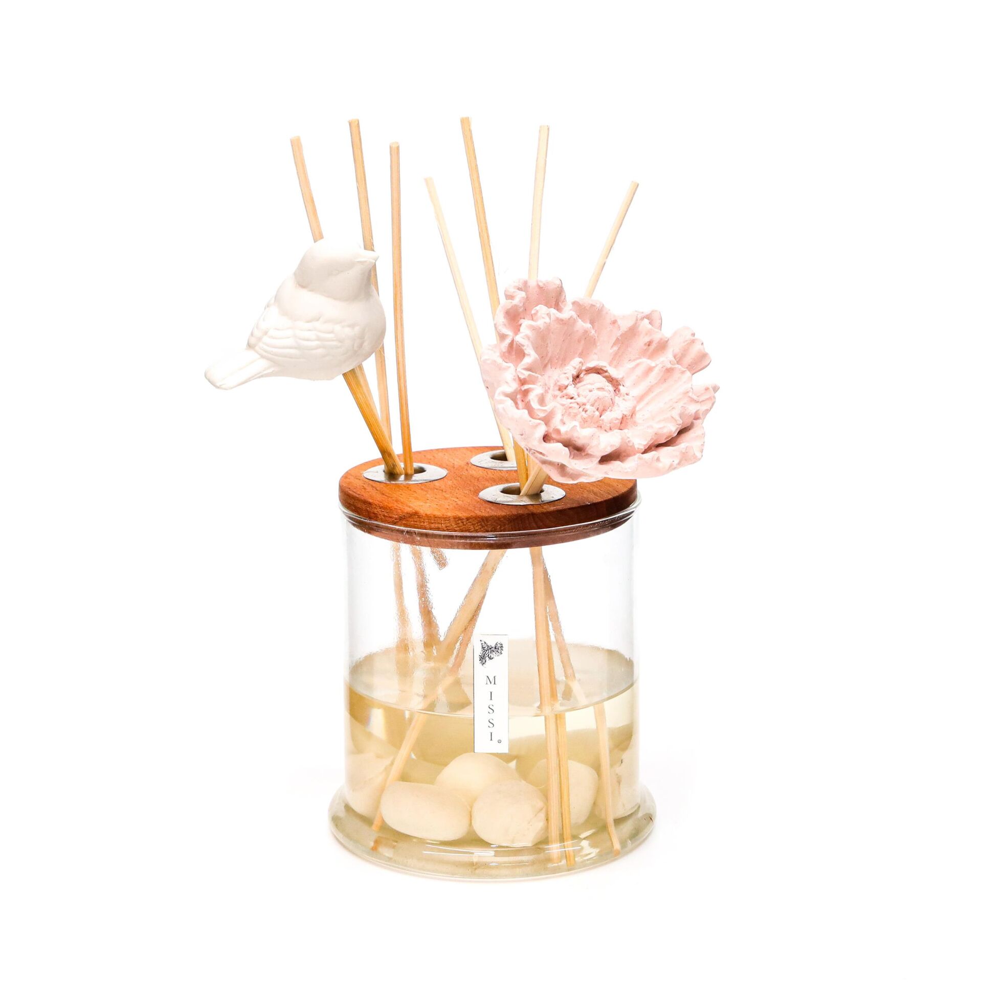 250 ml Dekorlu Oval Üfleme Cam Şişe Çiçek ve Kuş Taş Çubuklu Irıs Pudra Oda Kokusu