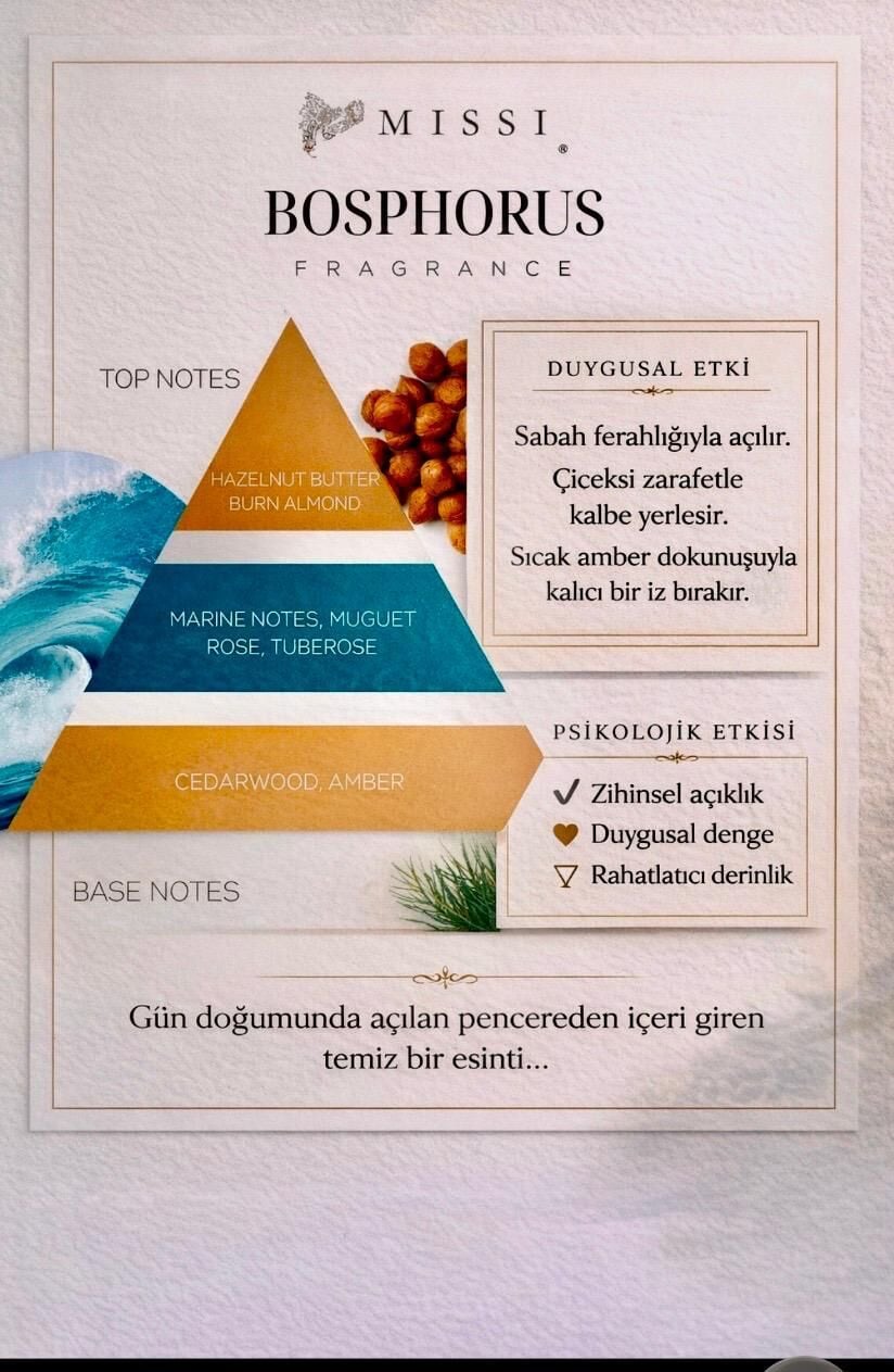 İstanbul Boğazı’nın büyüleyici serinliği, şimdi yaşam alanlarınıza taşınıyor… Bosphorus Oda Kokusu, deniz melteminin ferahlatıcı dokunuşunu, kıyı çiçeklerinin zarafetiyle harmanlayarak evinize benzersiz bir atmosfer katıyor.