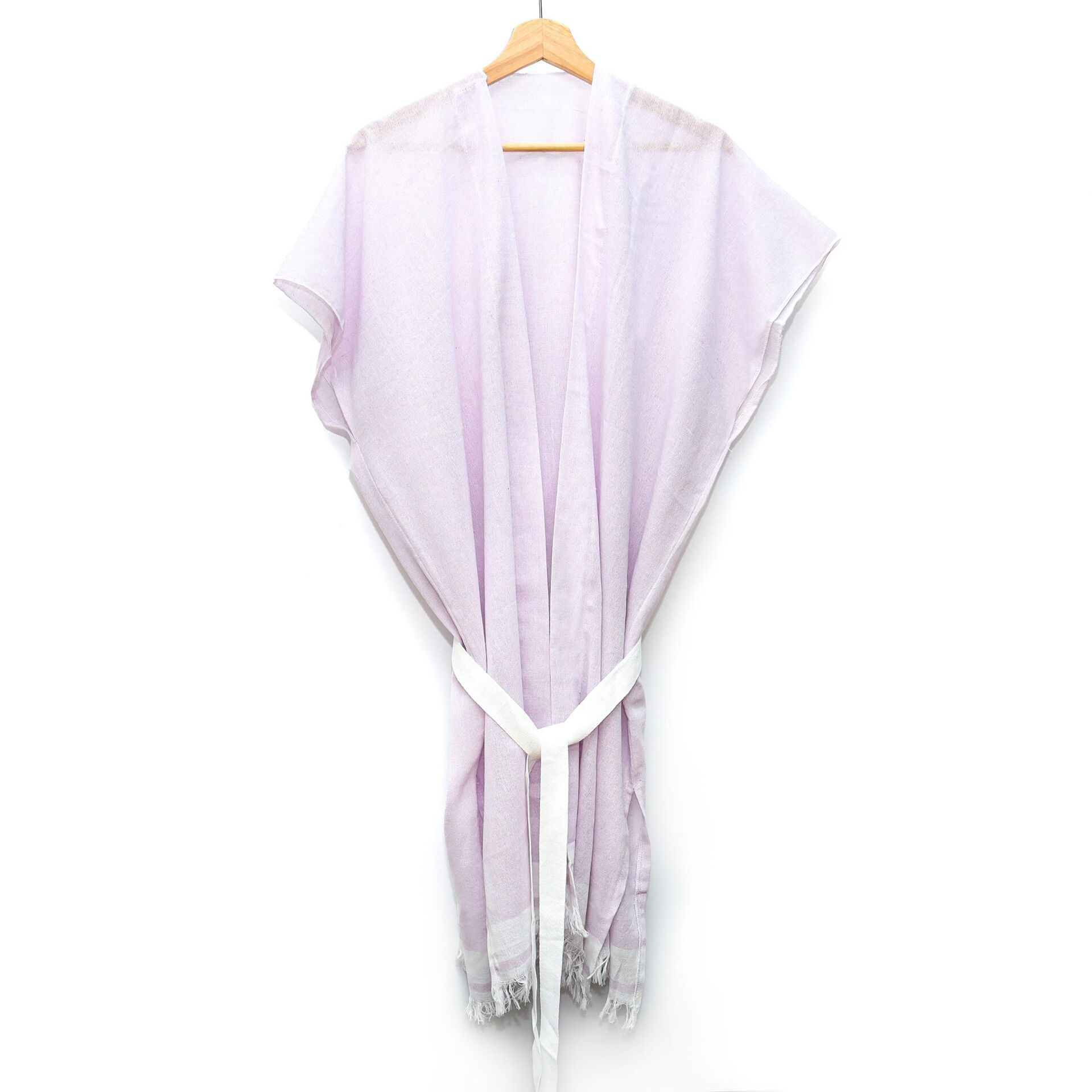 Beyaz Kuşaklı Açık Pembe Pamuk Peştemal Kimono