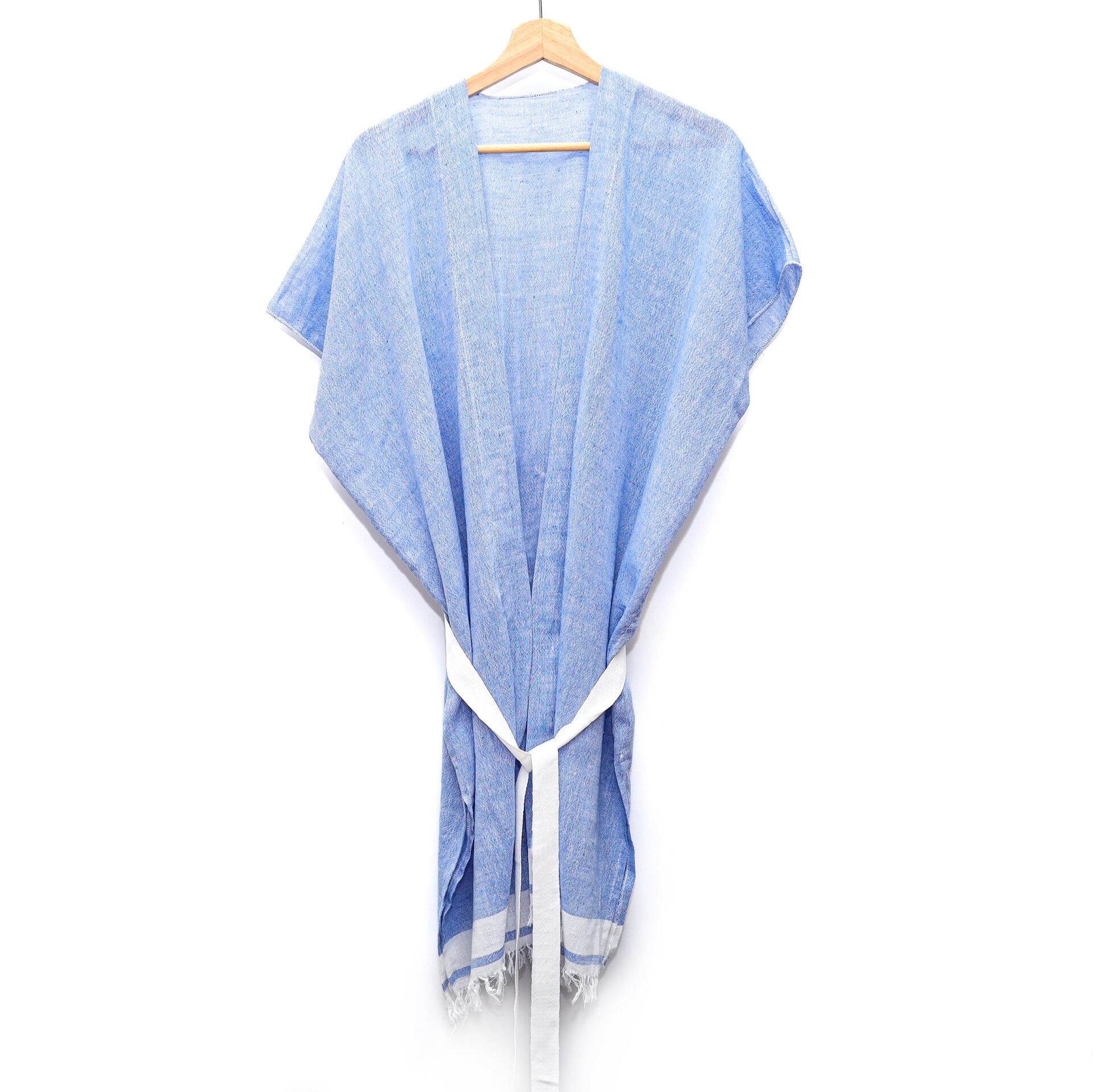 Beyaz Kuşaklı Mavi Pamuk Peştemal Kimono