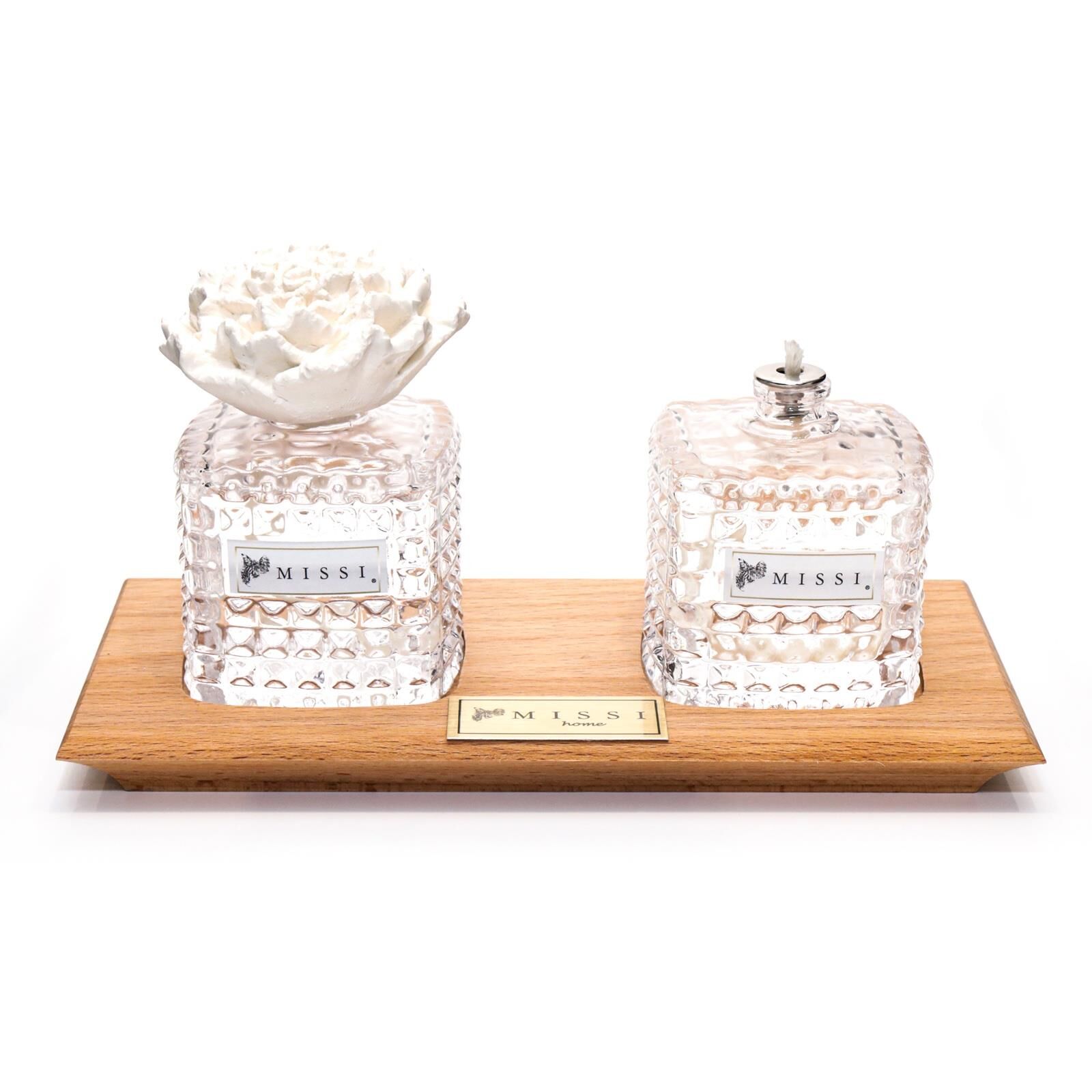 Masif Ahşap Tepsili Kare Kristal Şişe Yasemin Sandal Oda Kokusu ve Yasemin Sandal Kokulu Kandil Seti