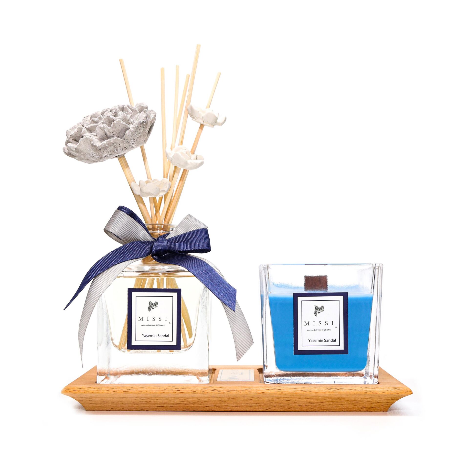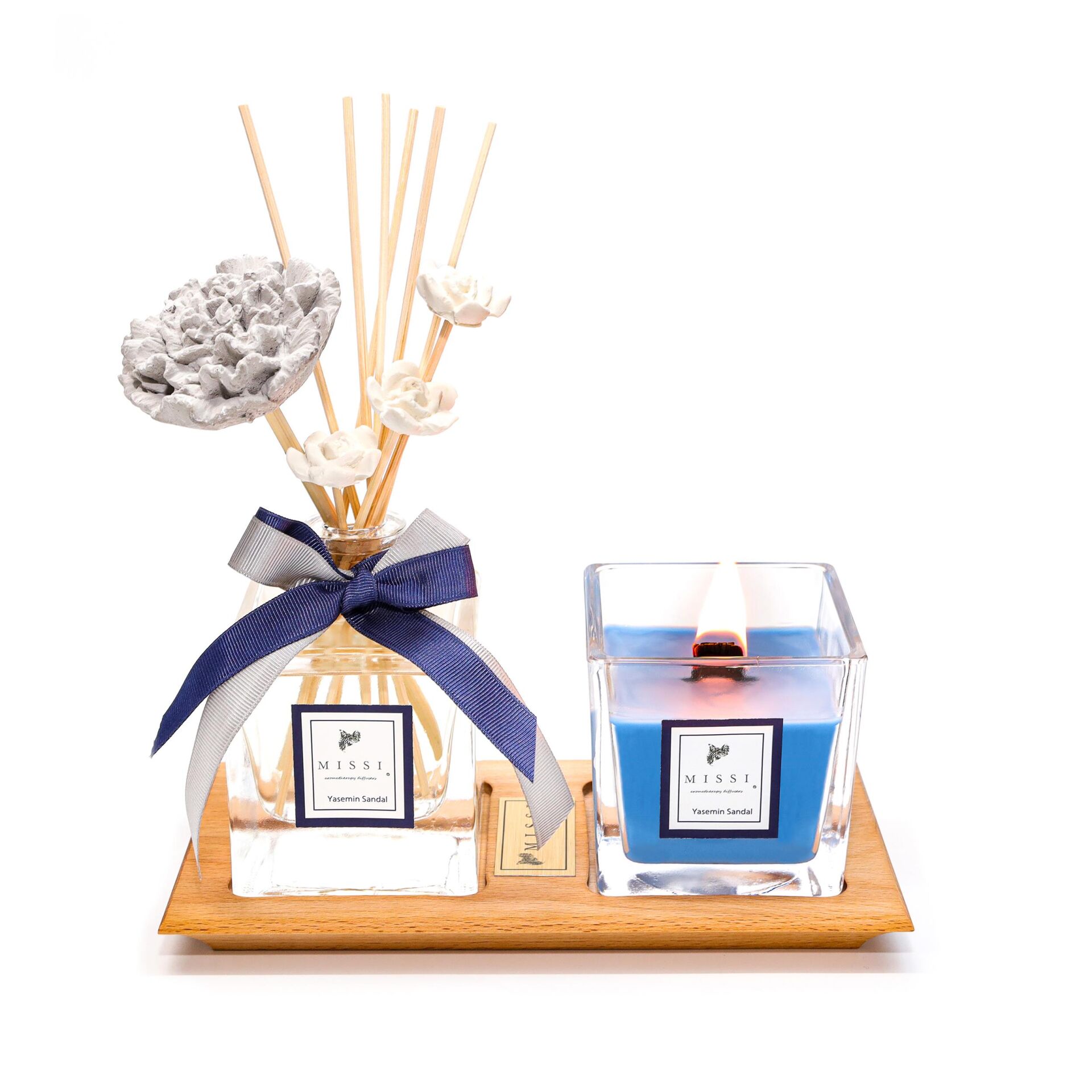 Masif Ahşap Tepsili Yasemin Sandal Oda Kokusu ve Mum Seti