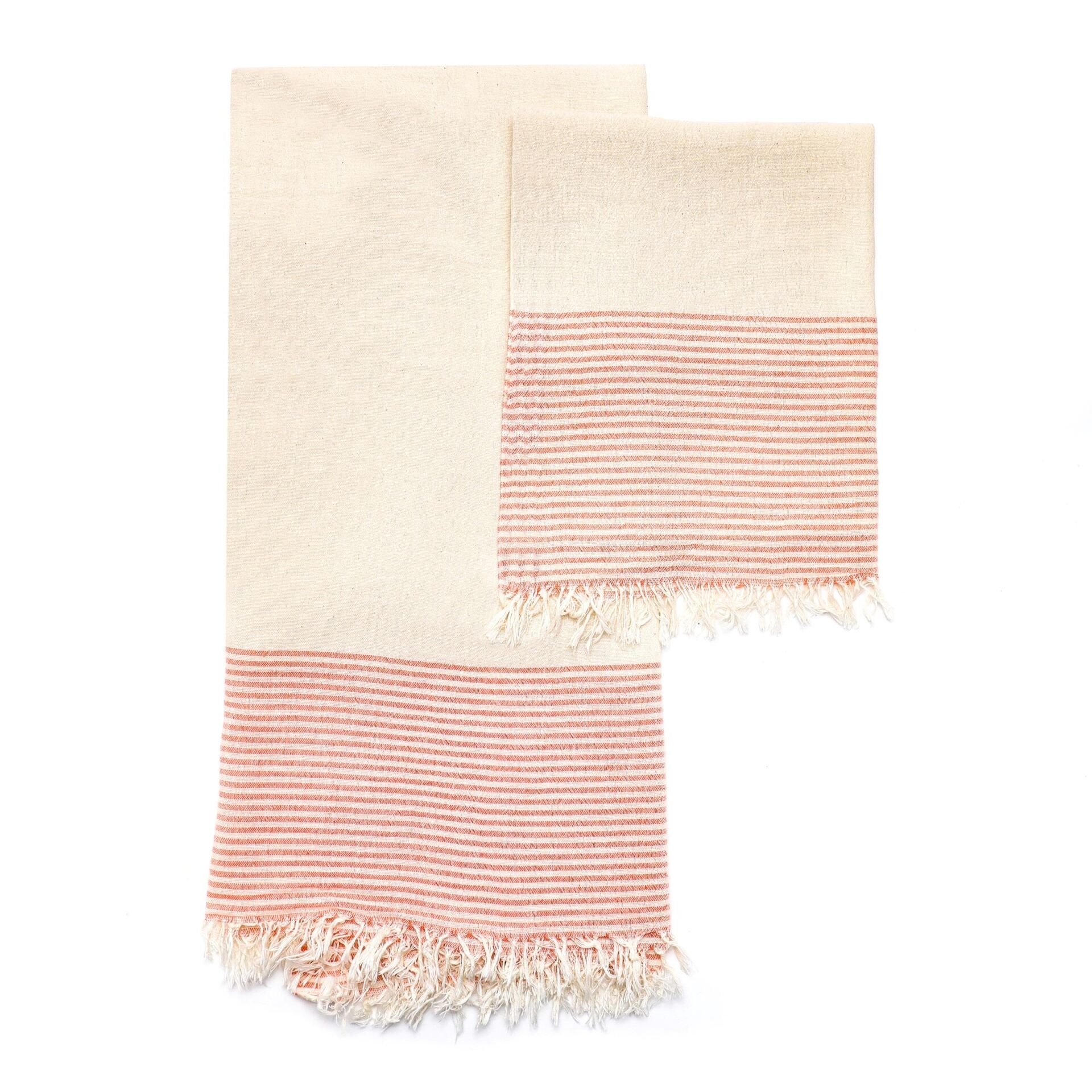 Ekru Renk Kırmızı Çizgili Pamuk Peşkir ve Peştemal Seti
