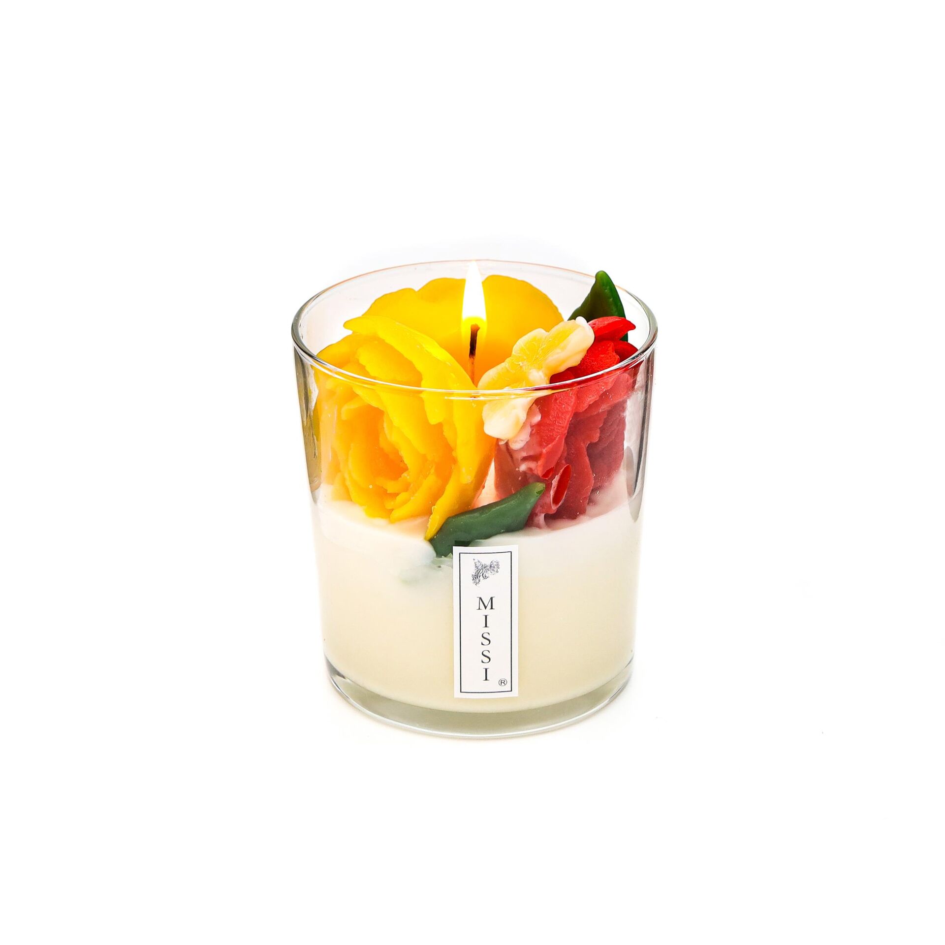 EL YAPIMI MİMOZA KOKULU SARI,KIRMIZI ÇİÇEKLİ BARDAK MUM