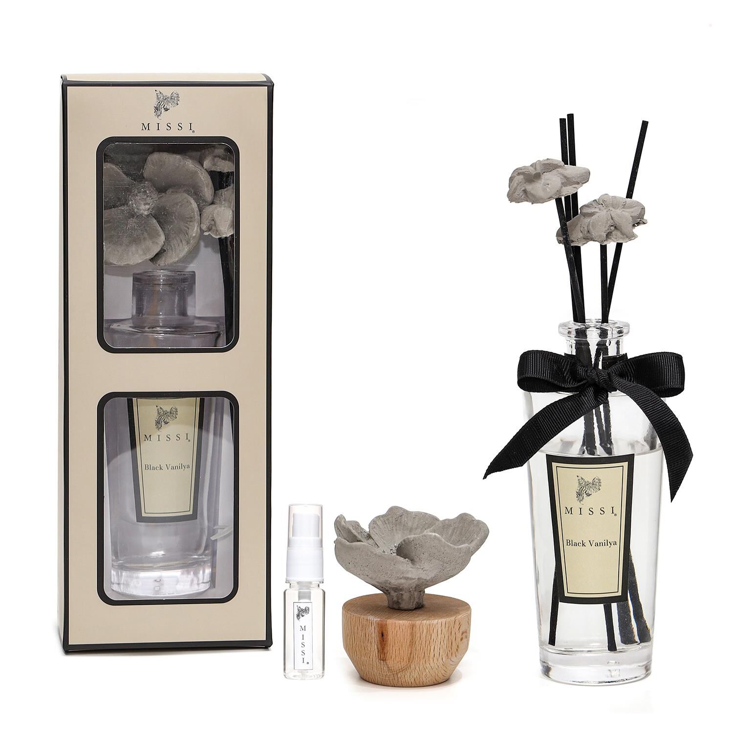 2)Ahşap kaideli çiçek seramik taş ve 15 ml black vanilya esansı. Seramik taşın esansı emme özelliği bulunmaktadır. Kokusu azaldıkça dilediğiniz kadar esans sıkabilirsiniz. Bulunduğu ortama koku yaymaktadır.