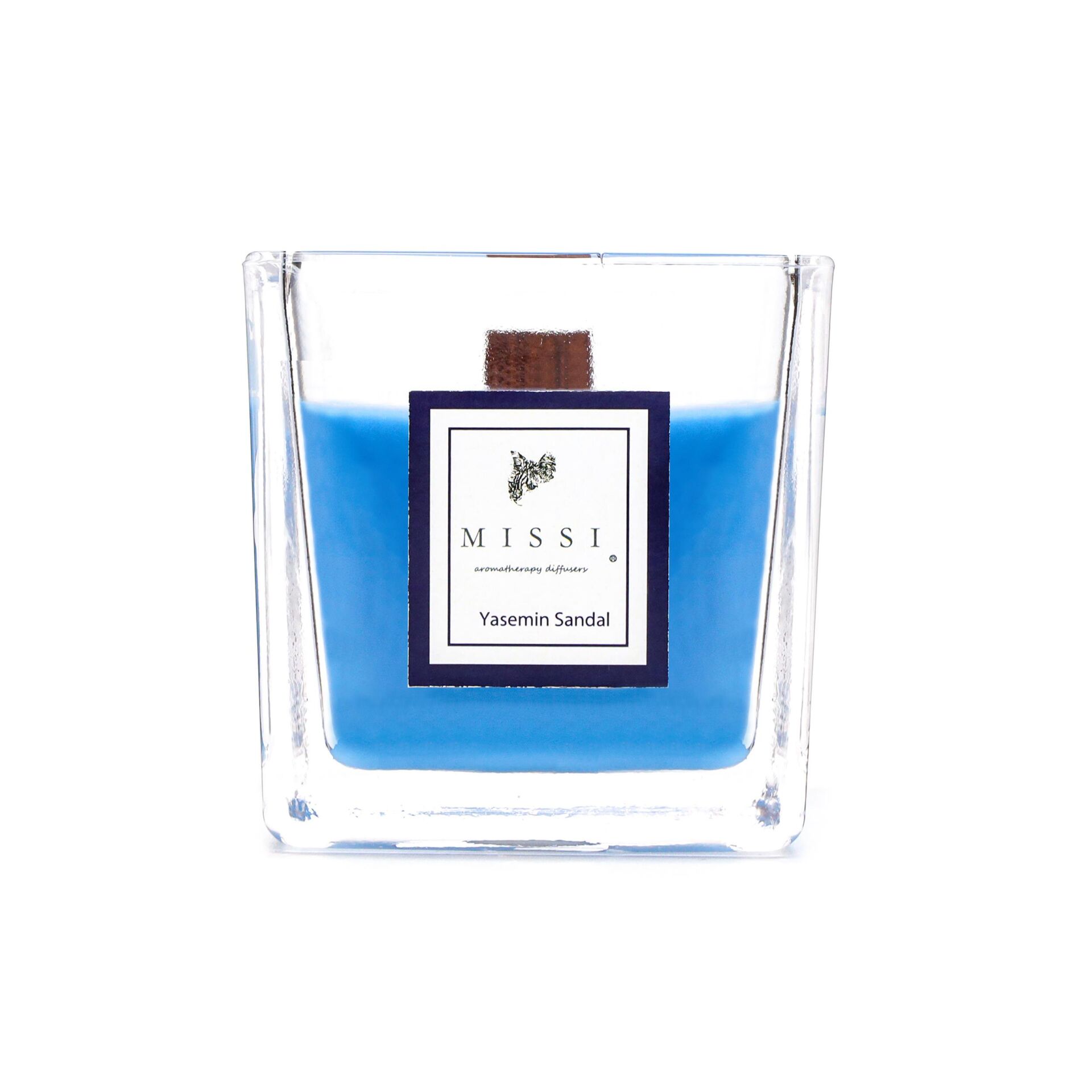 Kare Cam Ahşap Fitilli Mavi Yasemin Sandal Kokulu Vegan Mum (8X8 CM)