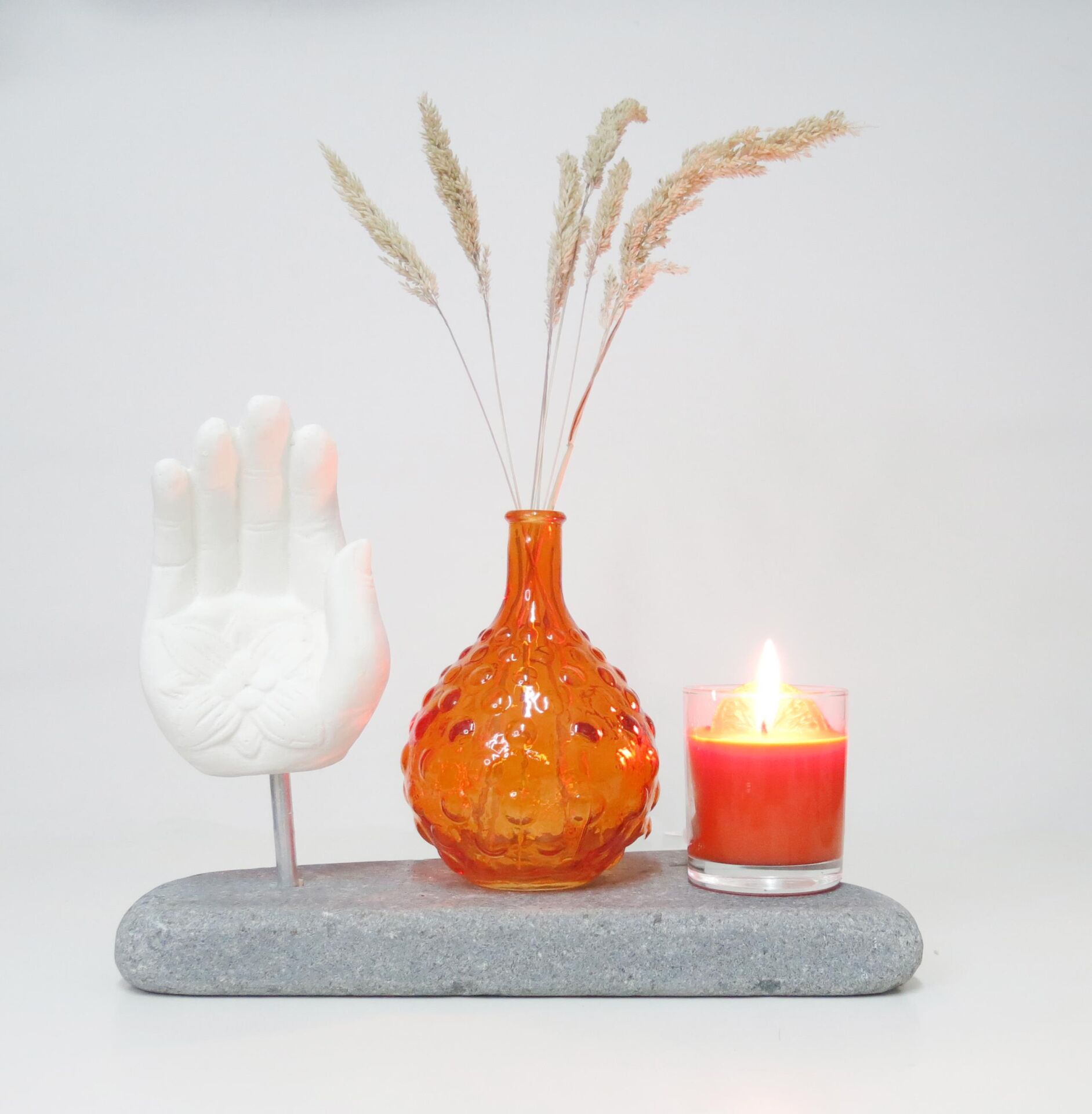 15 cc esans ile birlikte gönderilmektedir.Kaideler natürel olduğundan ebat ve renk tonlarında farklılık olabilmektedir.Seramik buddha eli paslanmaz metal boruyla taş kaide üzerine konmuştur.Buddha elinin yönü istenilen yöne hareket ettirilebilmektedir.İstendiği zaman çıkarılarak sadece kaide olarak da kullanılabilir.Gönderilen esans buddha eli üzerine sıkılarak bulunduğu mekana koku yaymaktadır. H ortamala 23 cm, en 22 cm