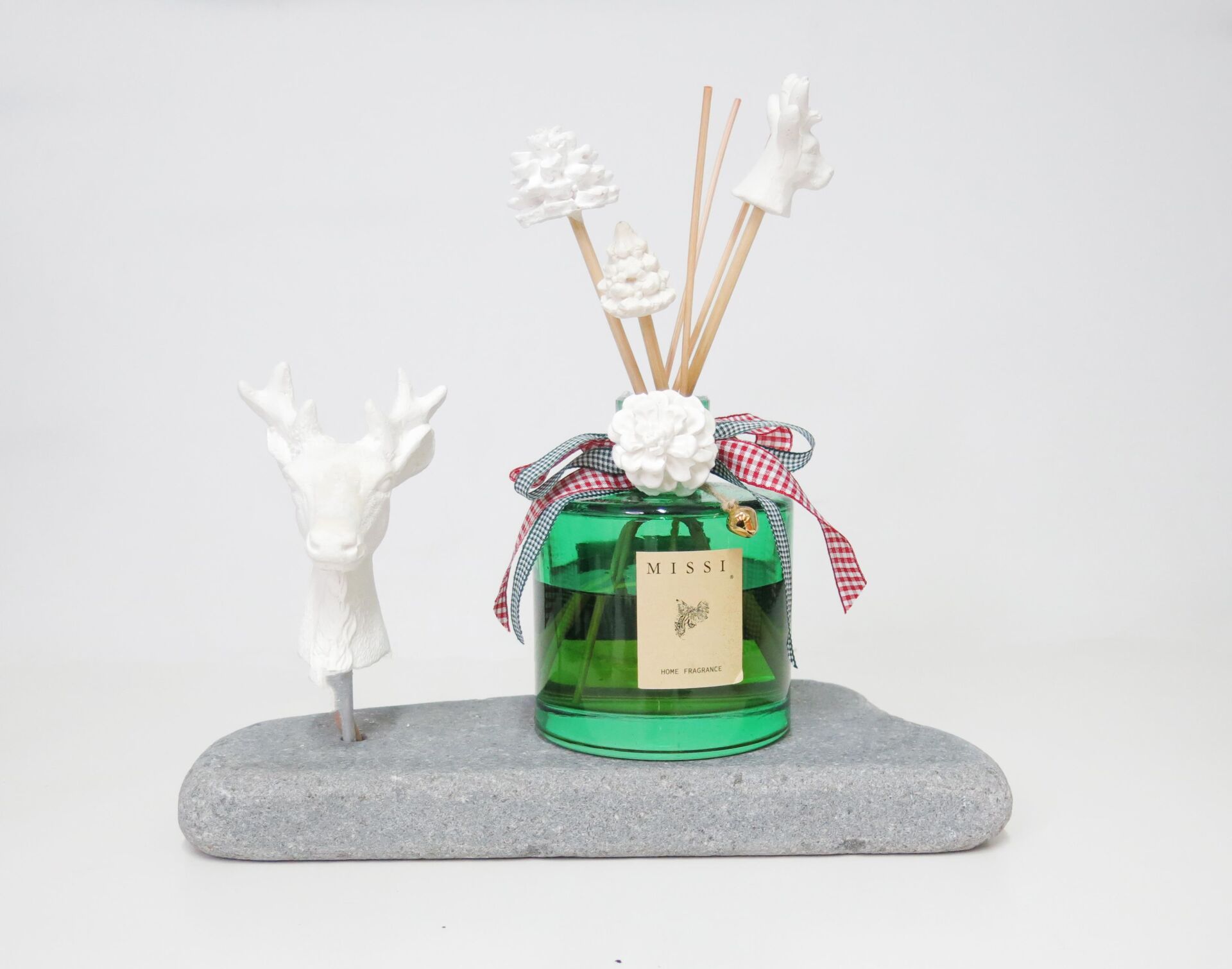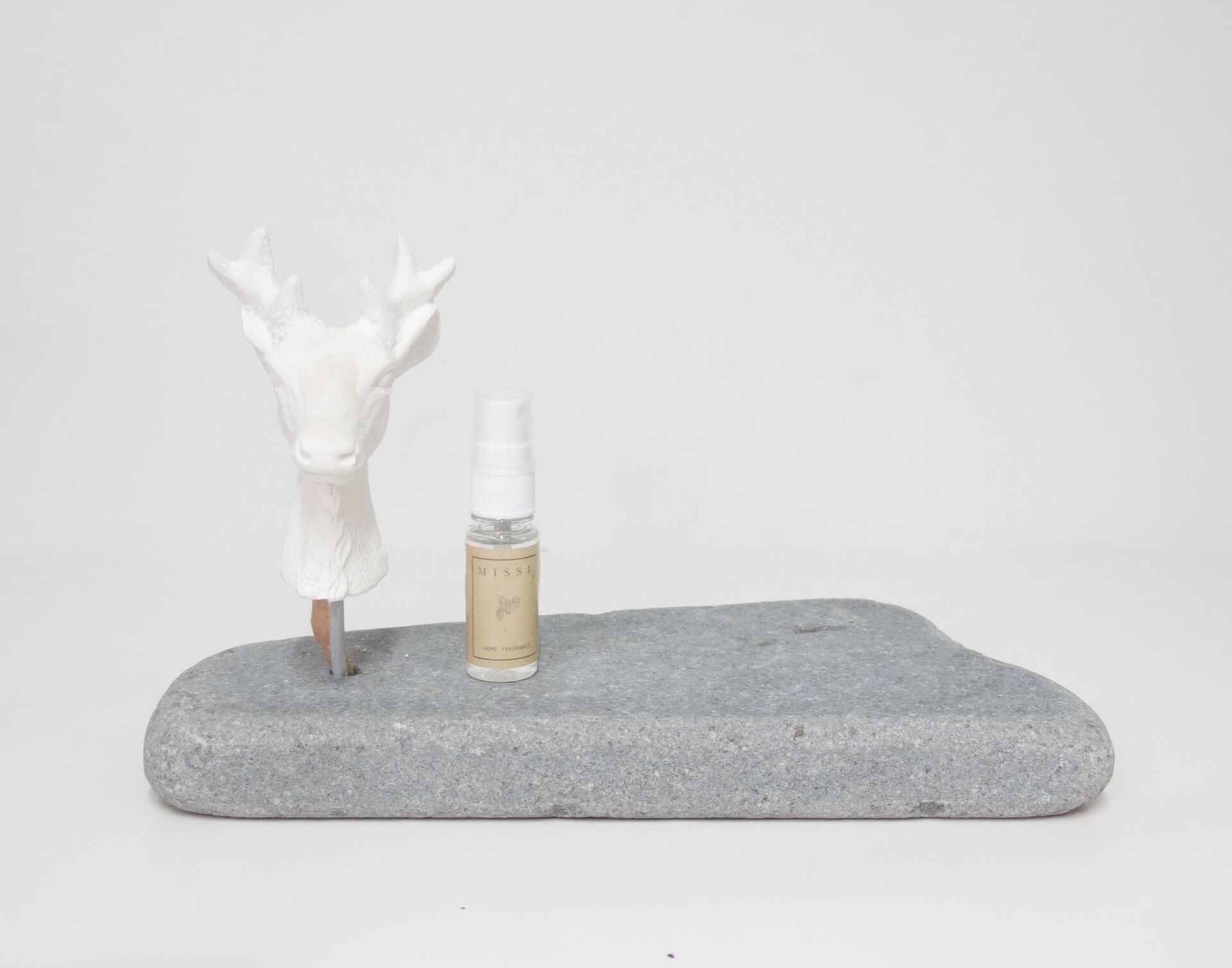 Doğal kaide, dekoratif heykel ve 15 cc esans ile birlikte gönderilmektedir.Kaideler natürel olduğundan ebat ve renk tonlarında farklılık olabilmektedir.Seramik geyik paslanmaz metal boruyla taş kaide üzerine konmuştur.Geyiğin yönü istenilen yöne hareket ettirilebilmektedir.İstendiği zaman çıkarılarak sadece kaide olarak da kullanılabilir.Gönderilen esans geyiğin üzerine sıkılarak bulunduğu mekana koku yaymaktadır. ort h:20cm en 22 cm