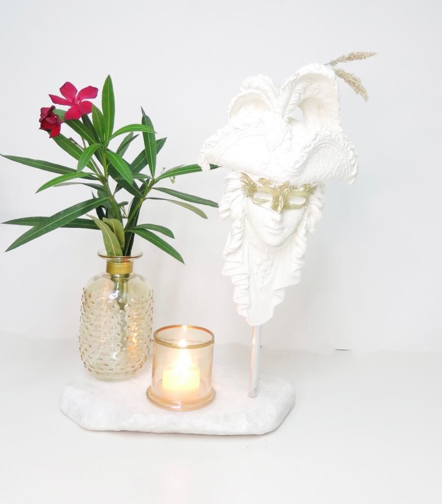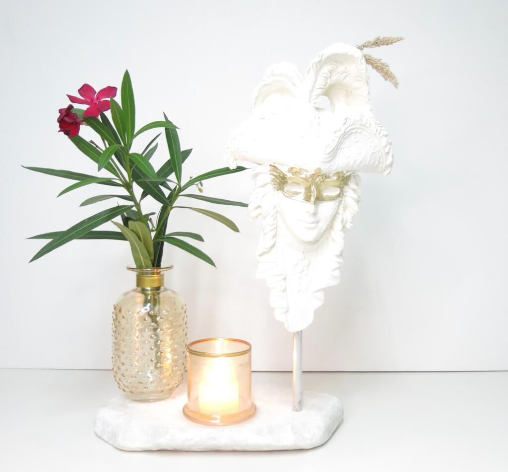 Doğal kaide, dekoratif heykel ve 15 cc esans ile birlikte gönderilmektedir.Kaideler natürel olduğundan ebat ve renk tonlarında farklılık olabilmektedir.Seramik maske paslanmaz metal boruyla taş kaide üzerine konmuştur.Maskenin yönü istenilen yöne hareket ettirilebilmektedir.İstendiği zaman çıkarılarak sadece kaide olarak da kullanılabilir.Kaide altında mobilyayı çizmemesi için yumuşak pabuç bulunmaktadır. Kaideyle birlikte ortalama h:40 cm. Kaide genişliği ortalama 24 cm