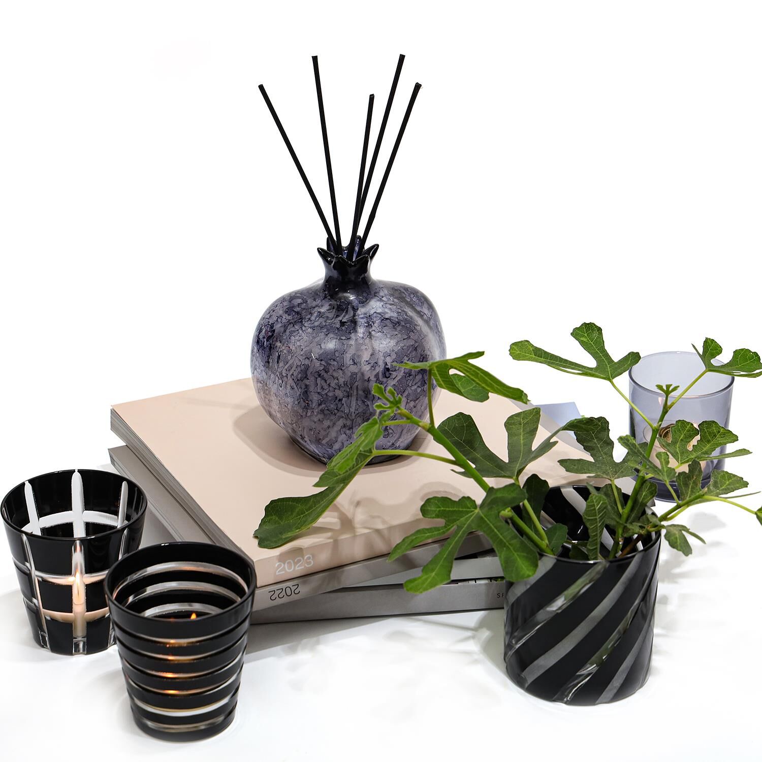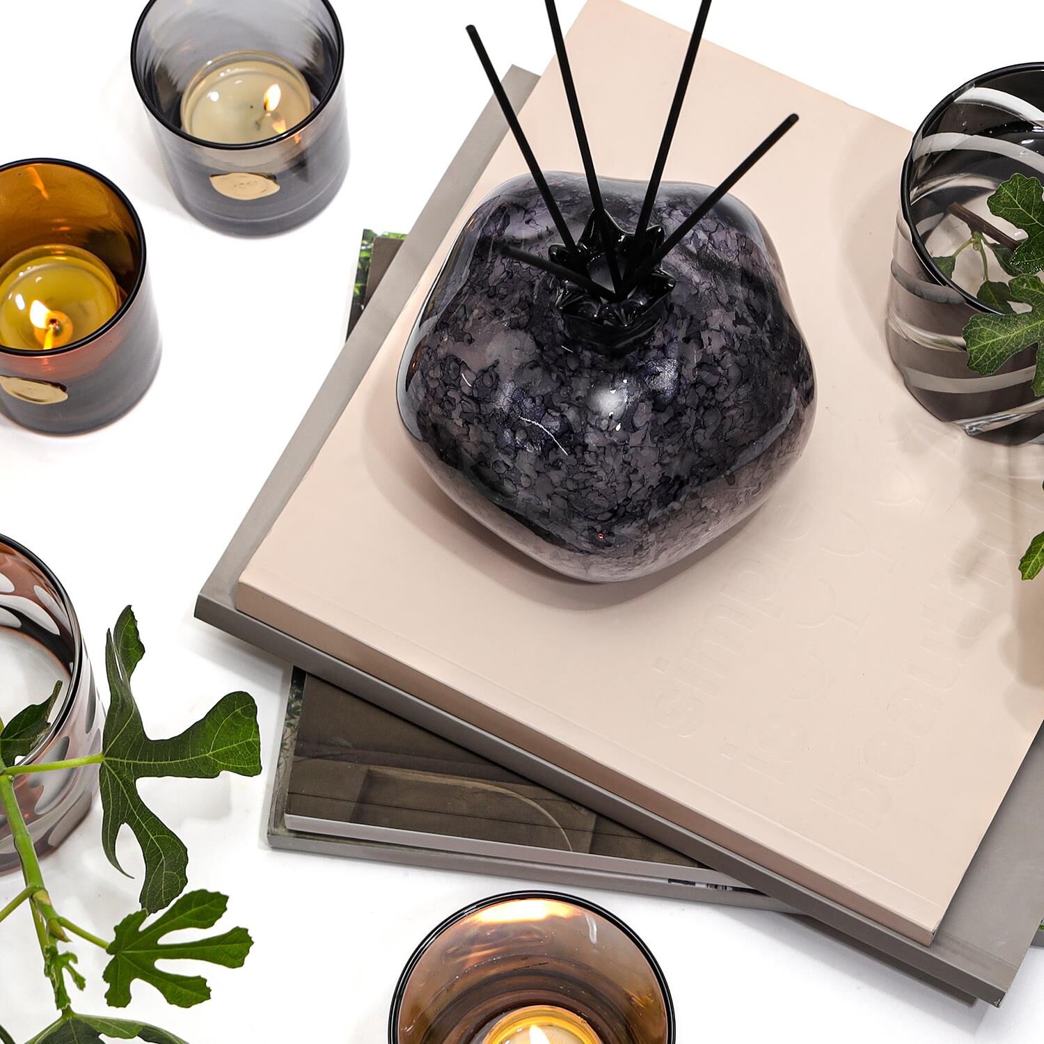 Tamamen el işçiliğiyle şekillendirilmiş,reçineden üretilmiş ve doğal batik boya tekniğiyle renklendirilmiştir.Transparan yüzeyinde ışıkla değişen tonlar,nar formunun bereket ve enerji sembolizmini modern bir yorumla buluşturur.İçine yerleştirilen esans çubuklarıyla hem görsel hem kokusal bir deneyim sunar.