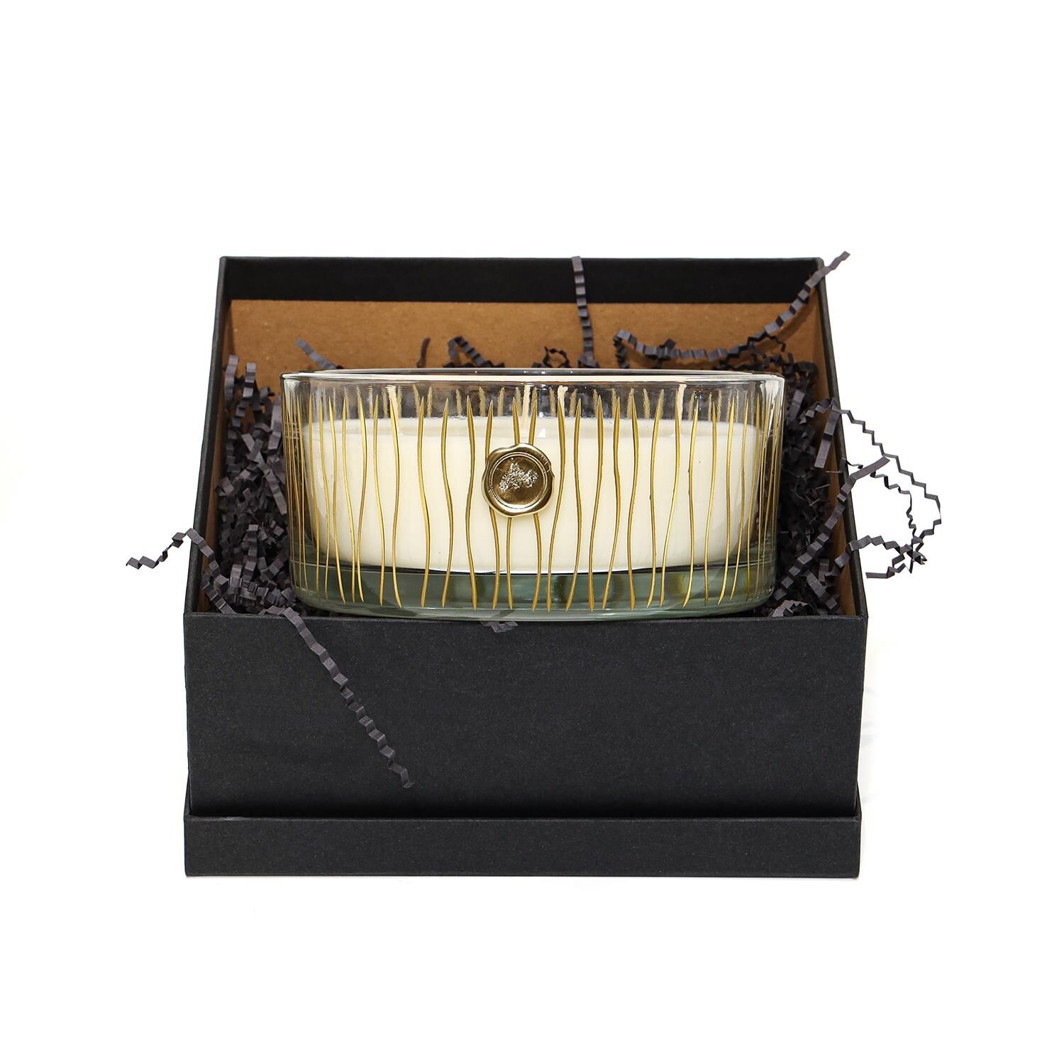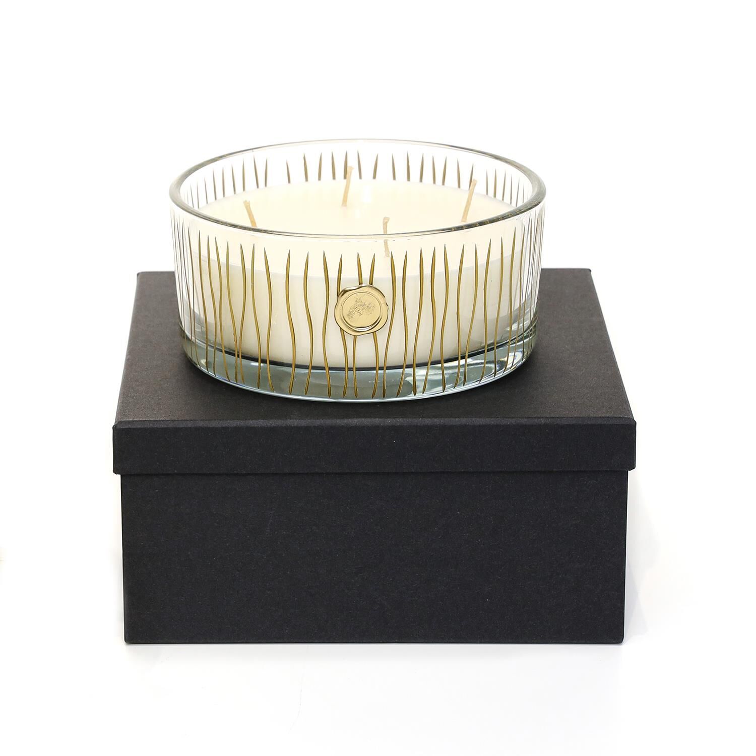 Özel El Kesimi Gold Çizgili Cam Çanak içi Oud Vanilya Kokulu Vegan Mum (Dekoratif Sıvama Kutulu)